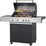 Tarrington House Barbacoa de gas Paxton de 4 + 1 Quemadores, Acero/Acero Inoxidable, Tapa con Termómetro, Mesa Auxiliar, Ruedas, Negro