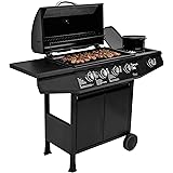 Amig - Barbacoa de gas Fireplus 4+1 de 9,3 kW - Acero inoxidable Negro - Parrilla con ruedas Modelo GRILL-4F - Barbacoa XXL con carro y termómetro - 126x52x103 cm - 5 quemadores y Bandeja lateral