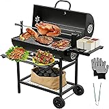 TEENO Parrilla para Barbacoa, Barbacoa de Carbóncon Espiedo Giratorio, Guantes y Pinzas Resistentes al Calor, Termómetro, Cajón para Cenizas y Rejillas de Ventilación Ajustables.