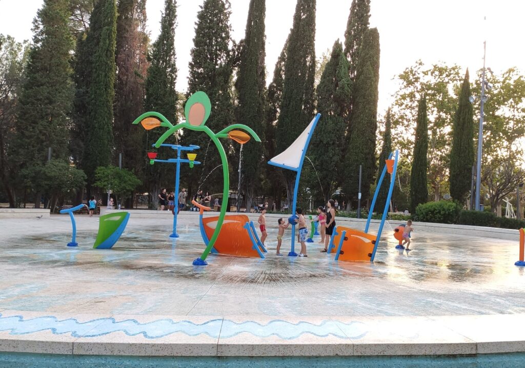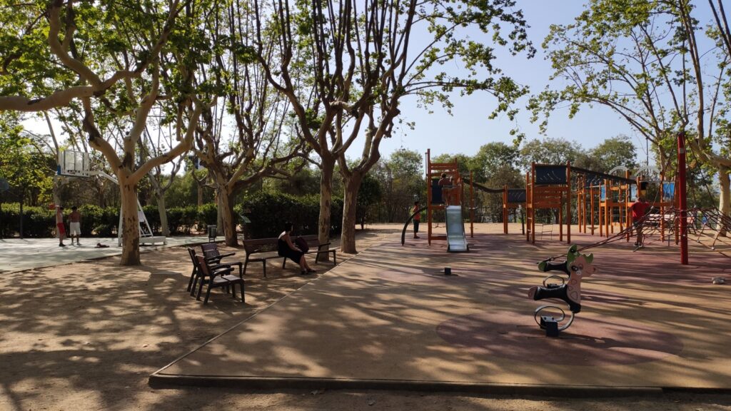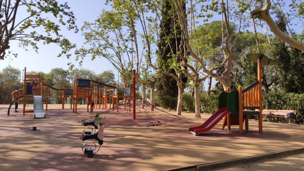 Por todo el parque veréis que hay diferentes espacios para disfrutar de un día de verano, desde un gran parque infantil muy completo en una zona sombreada, con toboganes, pasarelas, pirámide de cuerdas para escalar, balancines para los más pequeños.