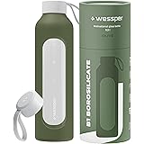 Wessper Botella de Agua Cristal, Botella 500 ml Motivadora con Escala de Hidratación, Botellas de Vidrio Borosilicato con Funda de Silicona, Material Seguro sin BPA - Oliva